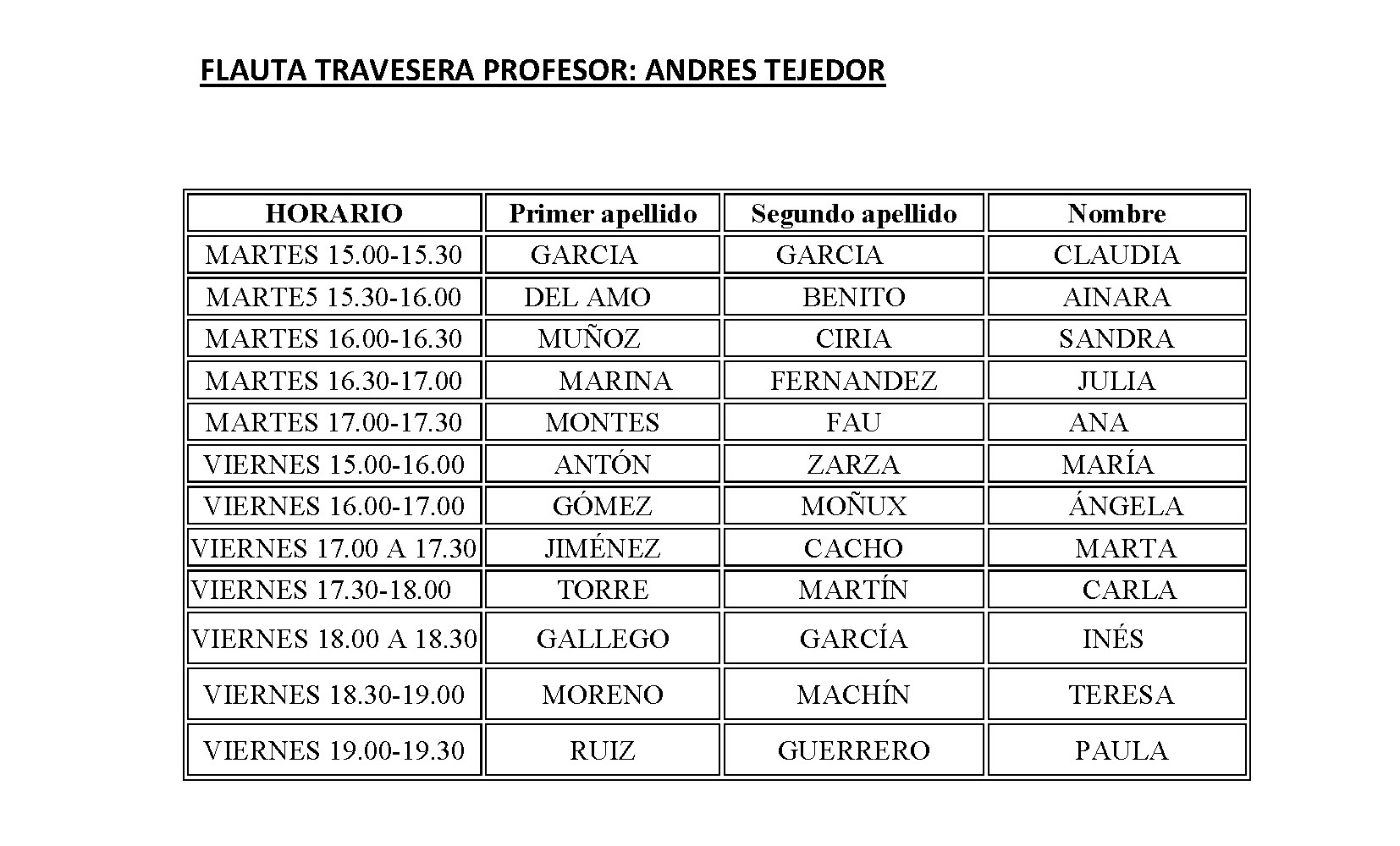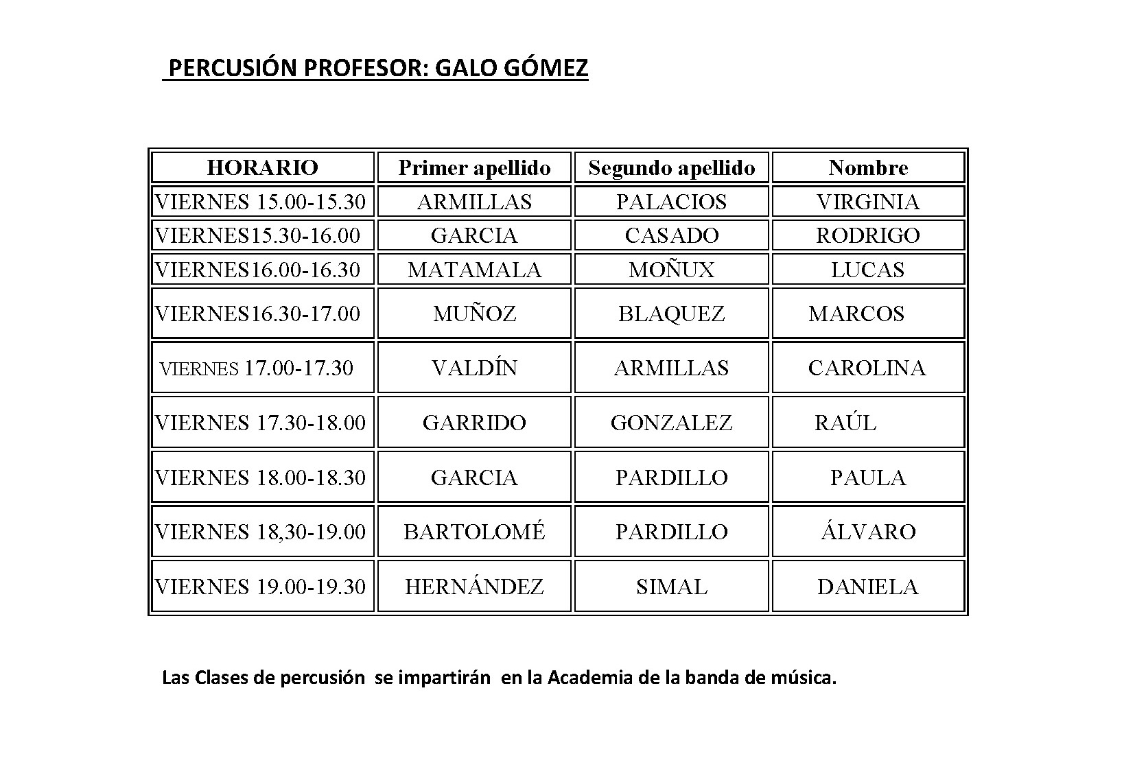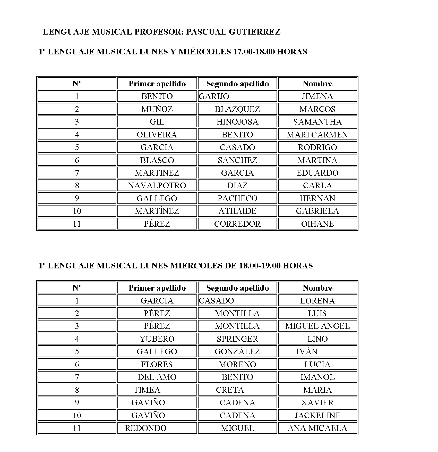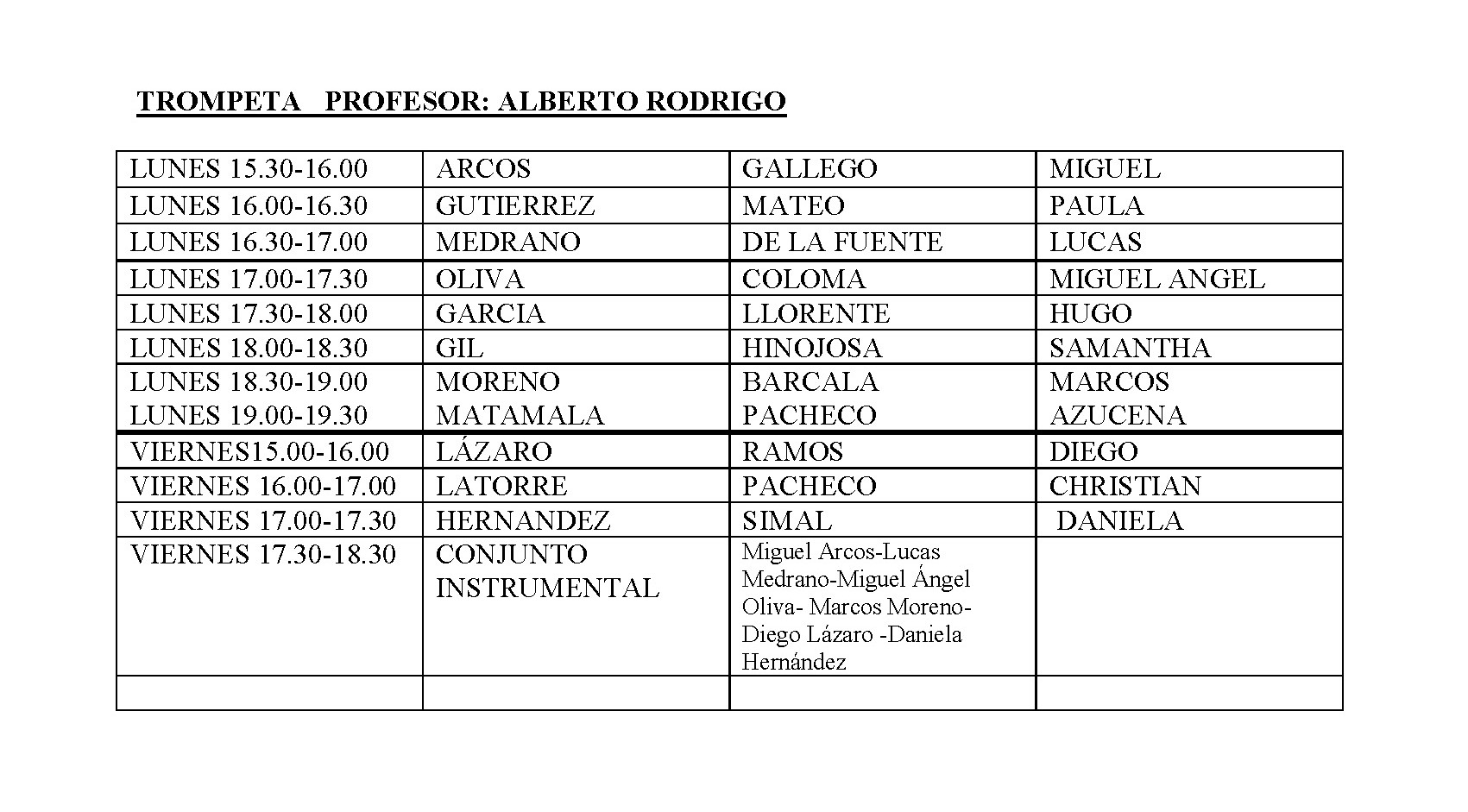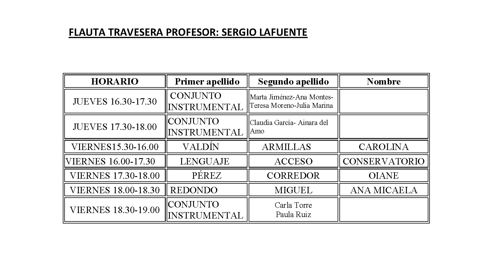 ESCUELA MUNICIPAL DE MÚSICA - HORARIO CURSO 2018-2019