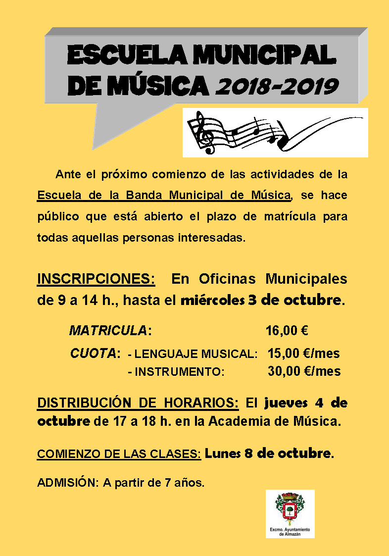 Las inscripciones se podrán hacer hasta el miércoles 3 de octubre en las Oficinas del Ayuntamiento, en horario de 9 a 14 h. de lunes a viernes. Los horarios se expondrán en la Academia el jueves 4 de Octubre. Las clases comenzarán el lunes 8 de Octubre.